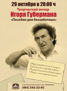 Игорь Губерман ждет вас по адресу: 23 км Рублево-Успенского шоссе, поселок Николино, ресторан Chester Ferry. Начало в 20:00. Телефон для справок: +7 (495) 545-33-95.