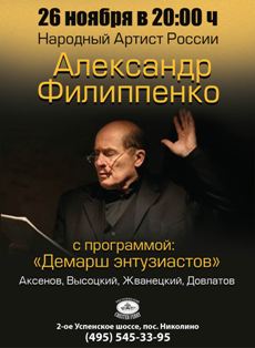 Моноспектакли и чтения Александра Филиппенко - это гениальные творения, в которых автор демонстрирует своё особое словесное мастерство. Достаточно отметить, что за прочтение «Мёртвых душ» актёру была присуждена Государственная премия. В своих программах, написанных по случаю и без, Филиппенко читал Зощенко, Довлатова, Высоцкого, Есенина, Бродского. Не теряя стилистической особенности, произведения всегда звучали ново и актуально. «Я хочу делиться с нынешним зрителем воспоминаниями, рассказывать ему о своей молодости. Гоголь называл театр некой кафедрой, с которой можно произнести сообщение зрителю» - говорит автор о своём моноспектакле «Демарш энтузиастов».