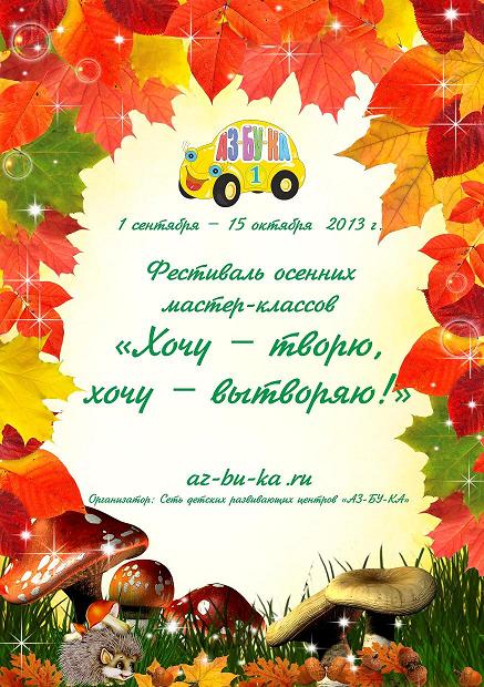 Сеть детских развивающих клубов «Азбука» приглашает Вас принять участие в осеннем фестивале творческих мастер-классов «Хочу – творю, хочу – вытворяю!». Осень - прекрасная пора для творчества, можно придумать столько всего интересного из разноцветных листьев, шишек, желудей и других природных материалов, которые преподносит нам это время года. Давайте делиться нашими поделками, ведь это не только полезно, но и очень приятно.